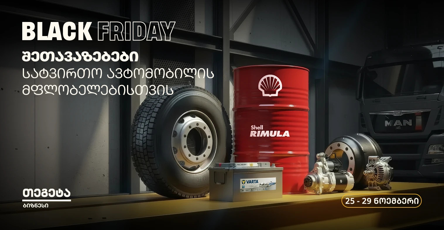 საავტომობილო პროდუქტების სრული სპექტრი და სააქციო ფასები სერვისებზე - სატვირთო და სპეციალური დანიშნულების ავტოტრანსპორტის მიმართულებით „თეგეტა მოტორსის“ ყველა ფილიალში განსაკუთრებული შეთავაზება ამოქმედდა. ფასდაკლებები 25 ნოემბრიდან 29 ნოემბრის ჩათვლით გრძელდება.